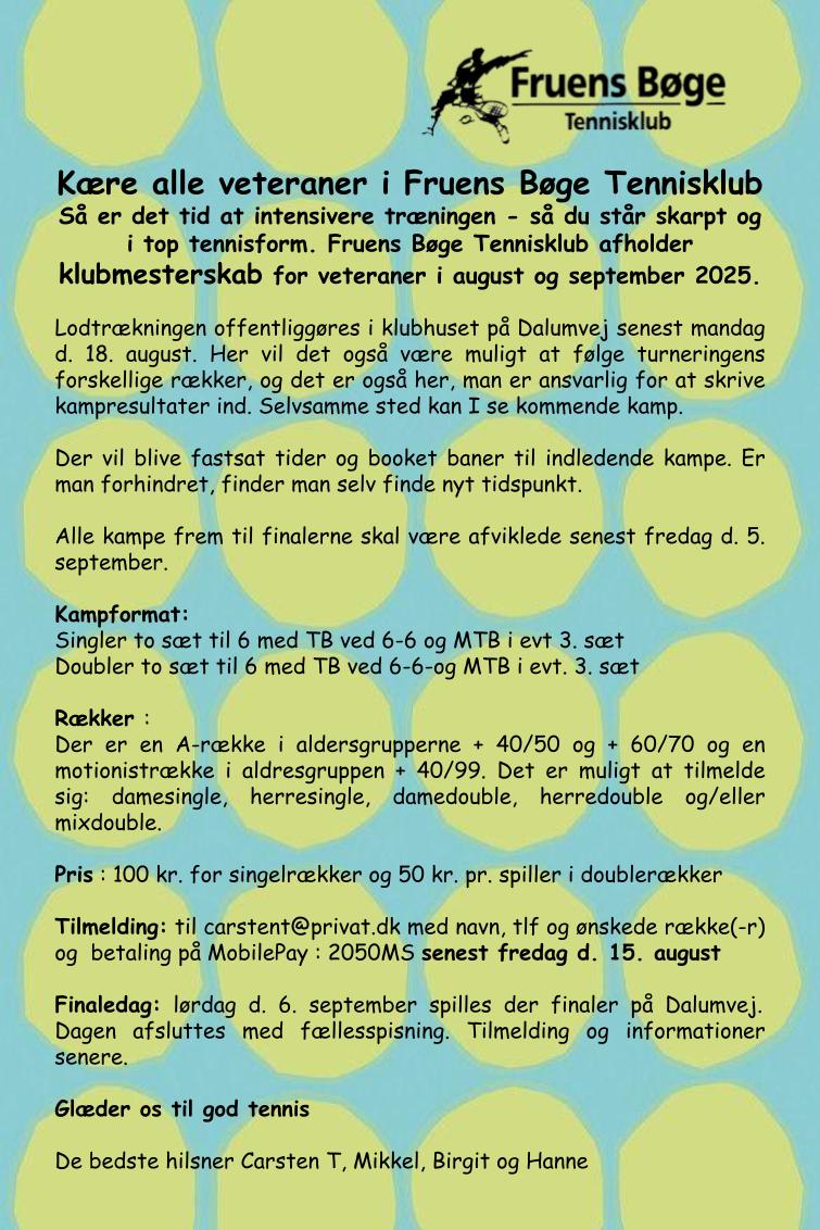 Kære alle veteraner i Fruens Bøge Tennisklub. Så er det tid til klubmesterskab.