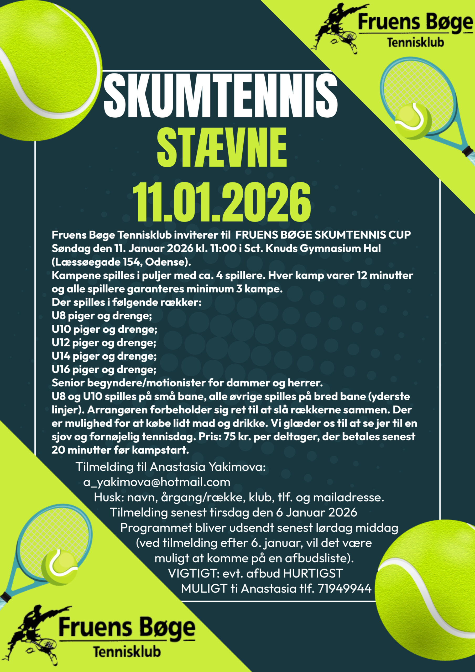 Fruens Bøge Tennisklub inviterer til SKUMTENNIS CUP Søndag den 11. Januar 2026 Se mere her 🙂