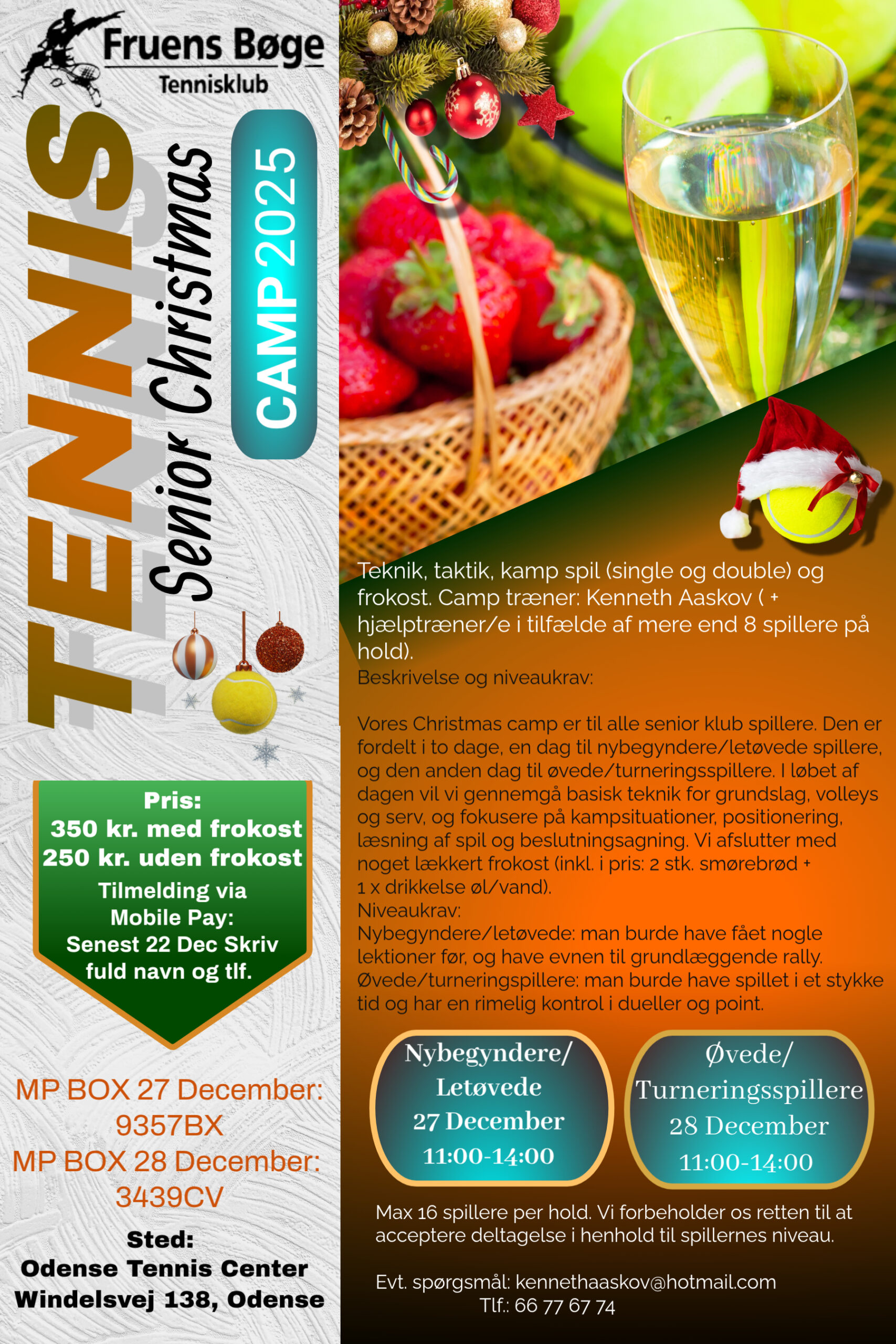 Vi inviterer til Senior Christmas Tennis Camp den 27. og 28. december!Glæd dig til masser af tennis, teknik, taktik og hyggelige timer på banen.Se mere her.
